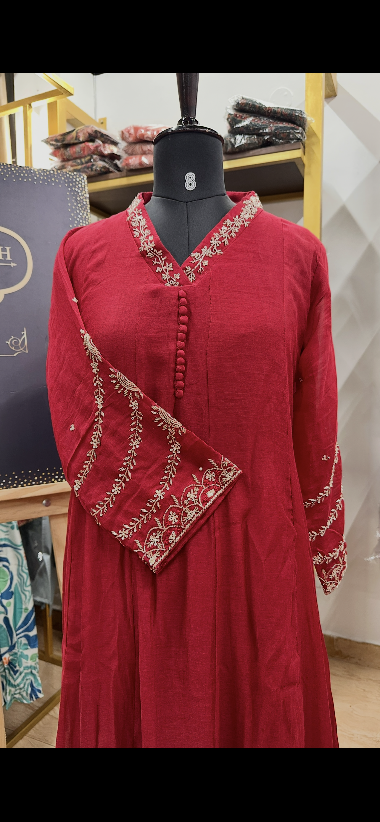 Premium mul chanderi suit with handwork detailing on neck yoke and sleeves